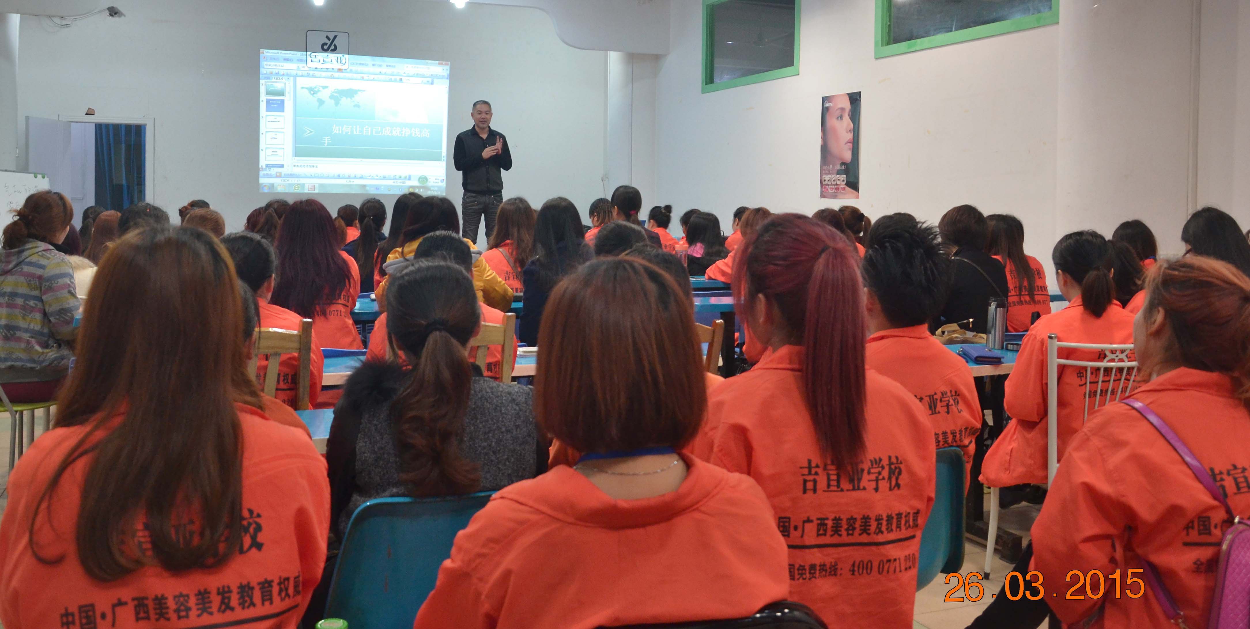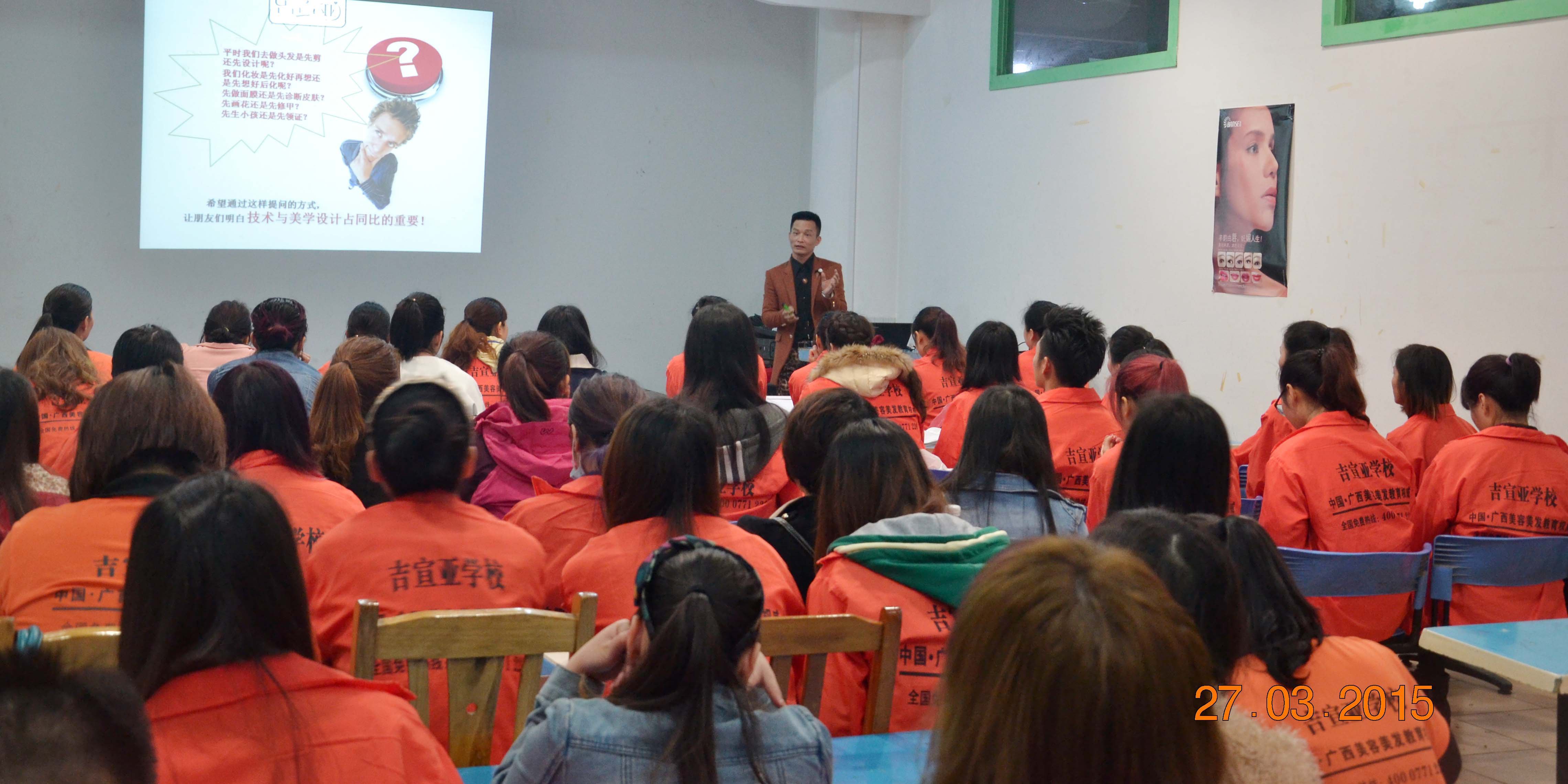 下午2:00,上课铃响,会议室里已经坐满了美容化妆组的学员们。吉校长此次亲自上课并不是讲解美容美发专业课知识,而是用幻灯片的形式给大家上了一堂美业微营销的课程,他结合自己丰富的创业经验和当下盛行的微营销方式,给还在为就业,创业而迷茫的学员们上了一堂别开生面的课,同时也为学员们解开了不少疑惑。