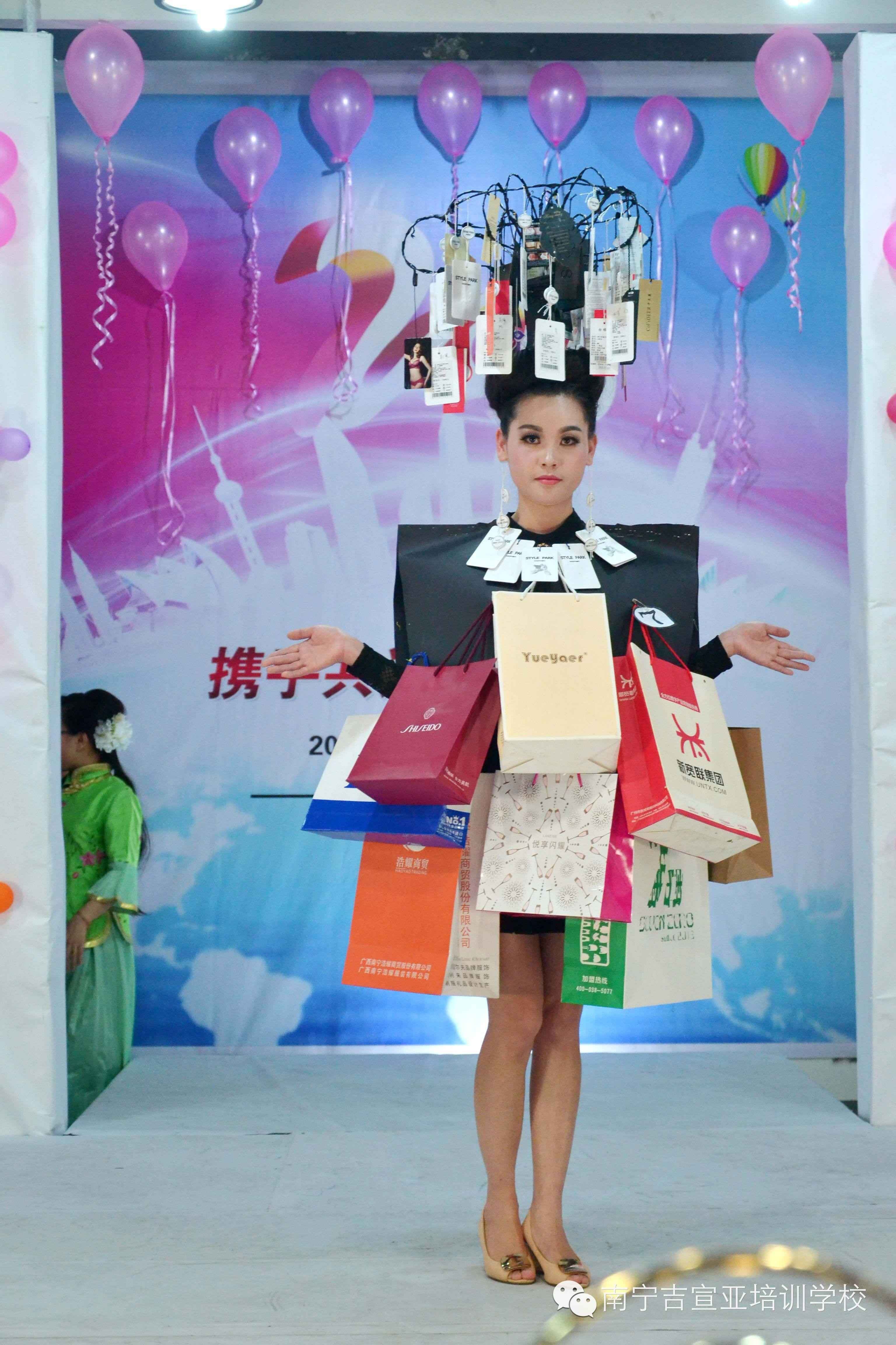 学员贺正猛的作品《名牌》则别出心裁,运用了数十种时尚品牌的服饰吊牌和包装袋,造型不仅新颖时尚,还体现了环保的生活态度。韦静云的作品《魅影》是十组作品中唯一运用男模特,并且创意非常独特,深深吸引了观众和评委的眼球。