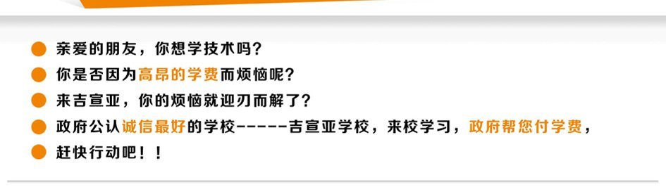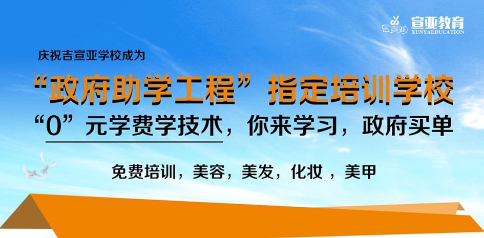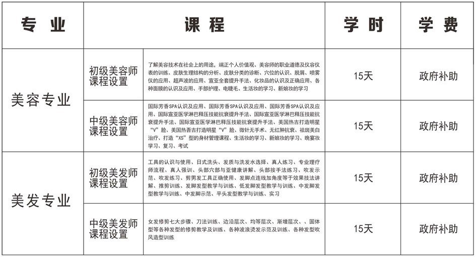 由政府全额补贴的课程有:美容,美发专业课程。由政府和吉宣亚学校共同出资补贴的免费学习课程有:化妆,美甲专业课程。学习时间均为15天。