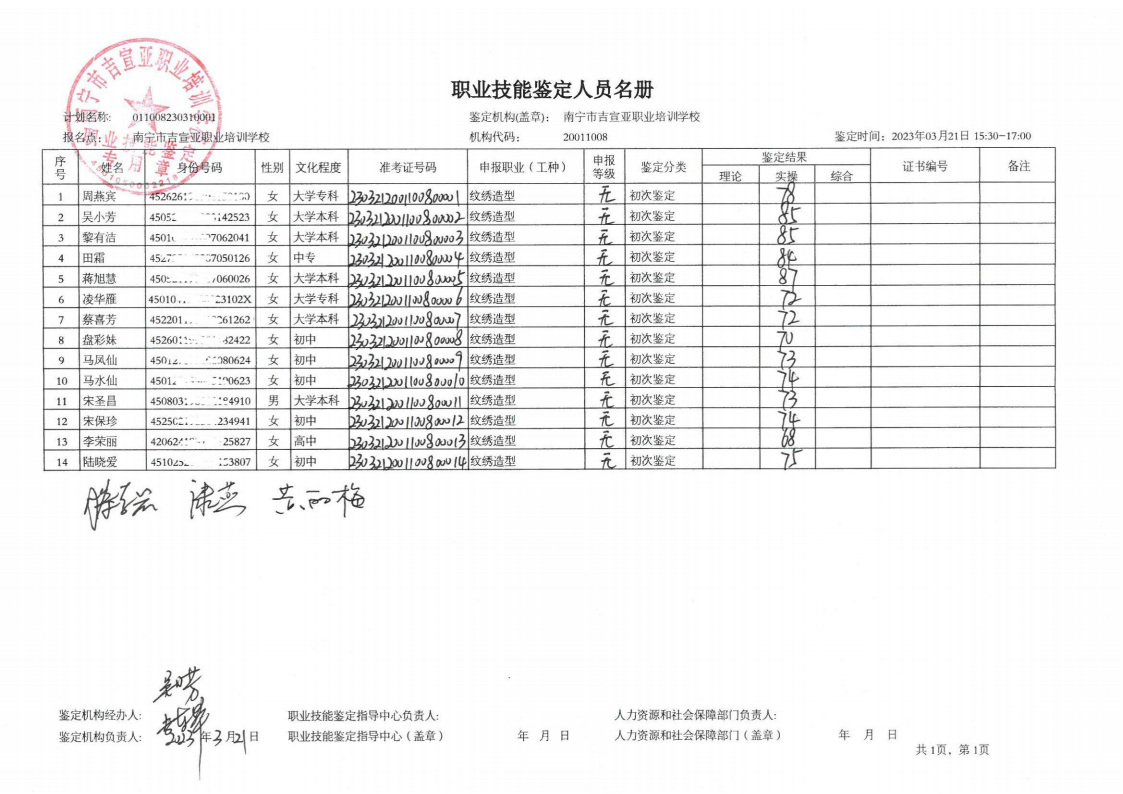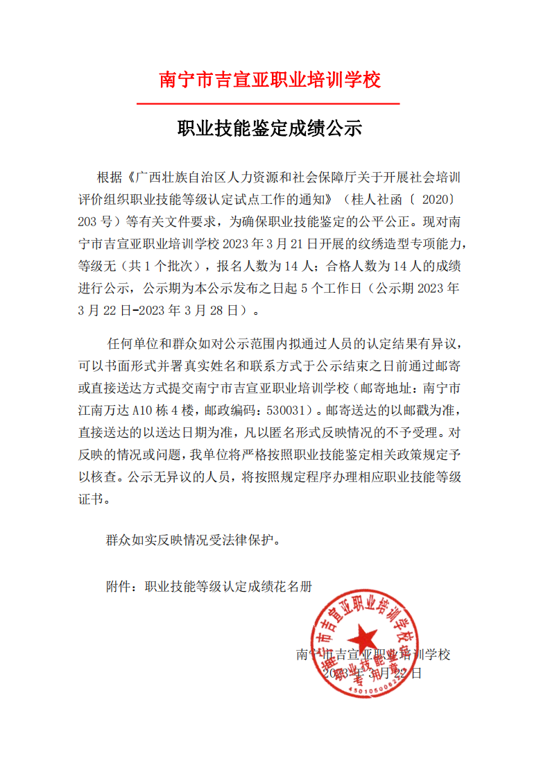 南宁市吉宣亚职业培训学校纹绣成绩公示
